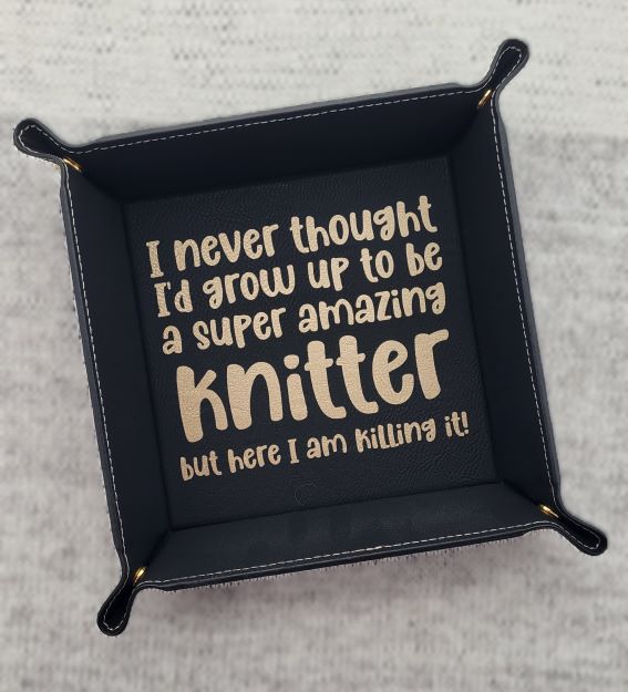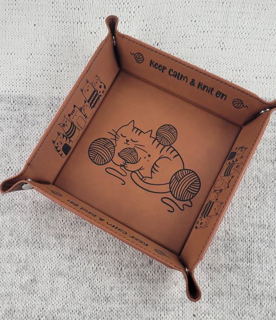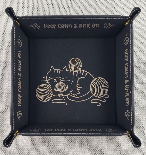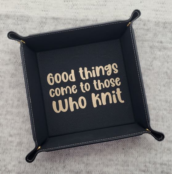 Perfect for keeping nearby your favorite knitting nook or crochet couch, a craft-themed tray for holding your stitch markers, embroidery scissors, etc.  These trays fold up and pinch closed at the corners, giving you a 6" x 6" tray with a one inch lip. Made of vegan leather, they can be spot cleaned with a damp cloth. Each tray design is available in the following colors: Black with gold design; grey with black design; rawhide brown with black design.