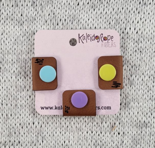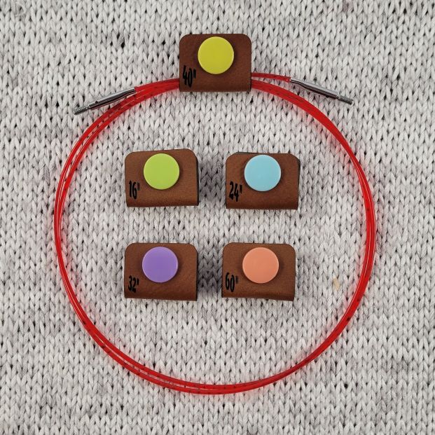 "Wrangle" your interchangeable needle cords and circular knitting needles from a chaotic jumble into an organized system using the Cord Wranglers. Each Wrangler is identified by the length of the cord or needle, with sizes ranging from 16" to 60". The size is etched into both sides of the vegan leather Wranglers. Simply coil your cord or needle and snap the Wrangler over the overlapping section of the cords. Viola, you can now keep your cords and needles organized by length!