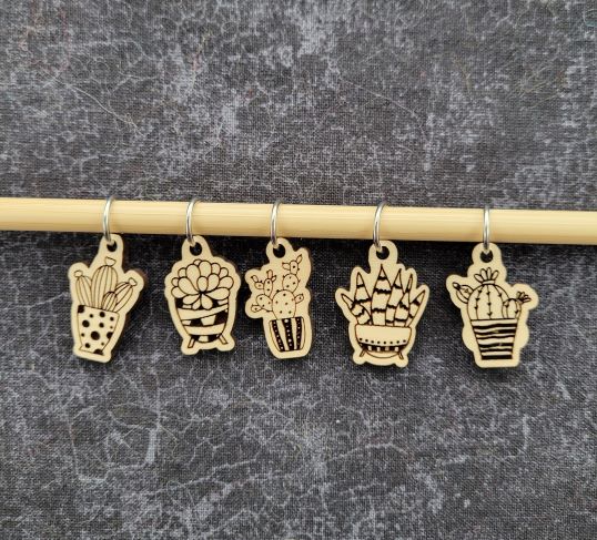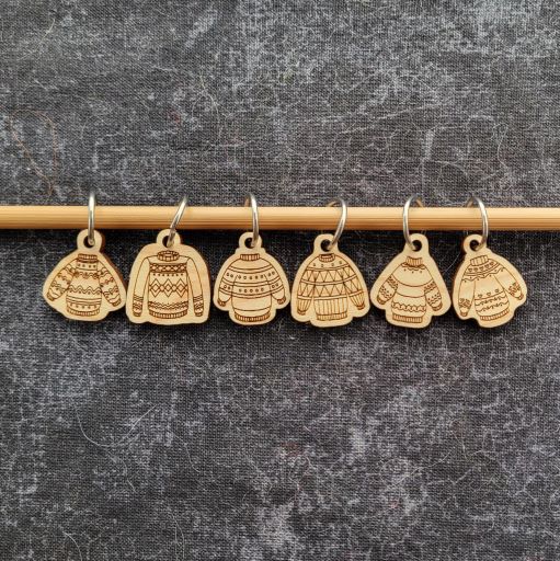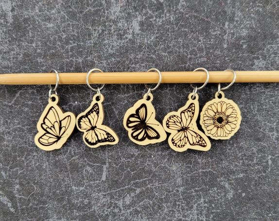 Kaleidoscope Fibers. Stitch marker sets made from laser cut and engraved hardwood. Hardwoods used are ash, cherry and maple. Markers will fit up to US #10 needles. Find a set that suits your personality or project!